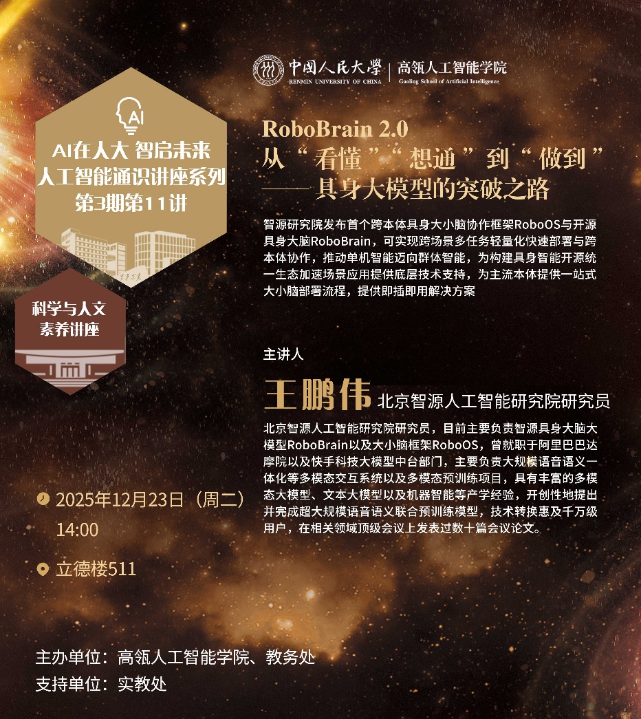 讲座题目:RoboBrain 2.0 从 “看懂”“想通” 到 “做到”—— 具身大模型的突破之路