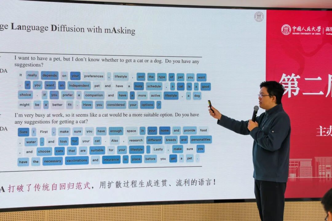 李崇轩副教授分享了题为“LLaDA:大语言模型新范式”的报告。他首先回顾了生成式大模型的发展,并提出大语言模型的良好性质主要来自于生成式建模而非扩散模型的洞察。随后,介绍了构建扩散大语言模型 LLaDA 的技术路线、训练策略,以及 LLaDA 的影响力。最后介绍了扩散大语言模型对齐、多模态、混合专家架构等领域的前沿进展。