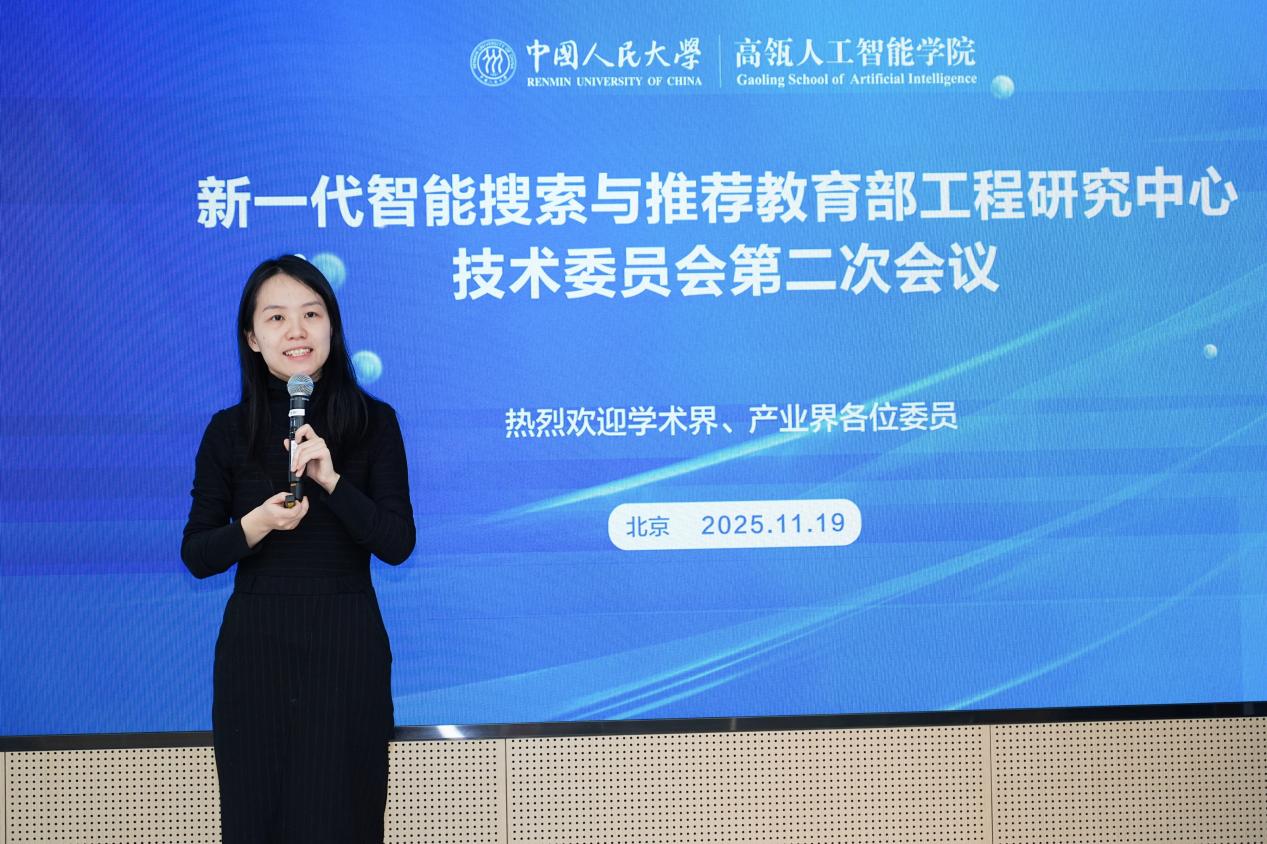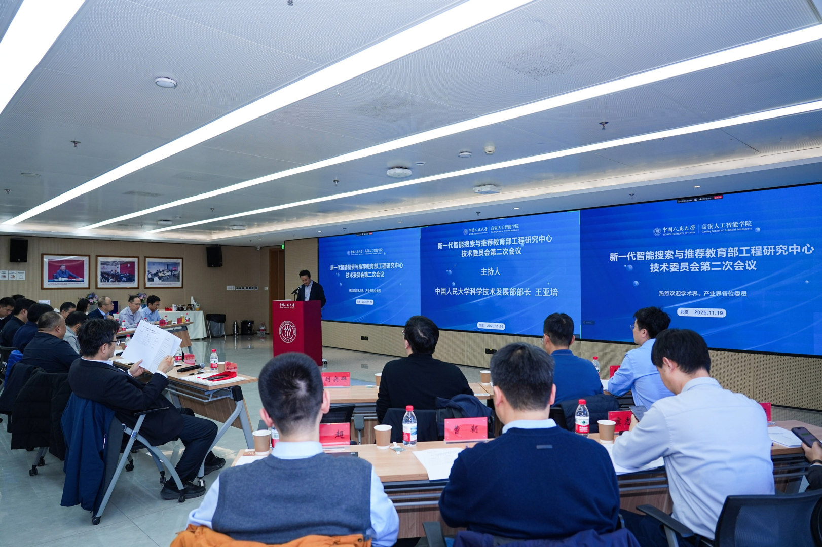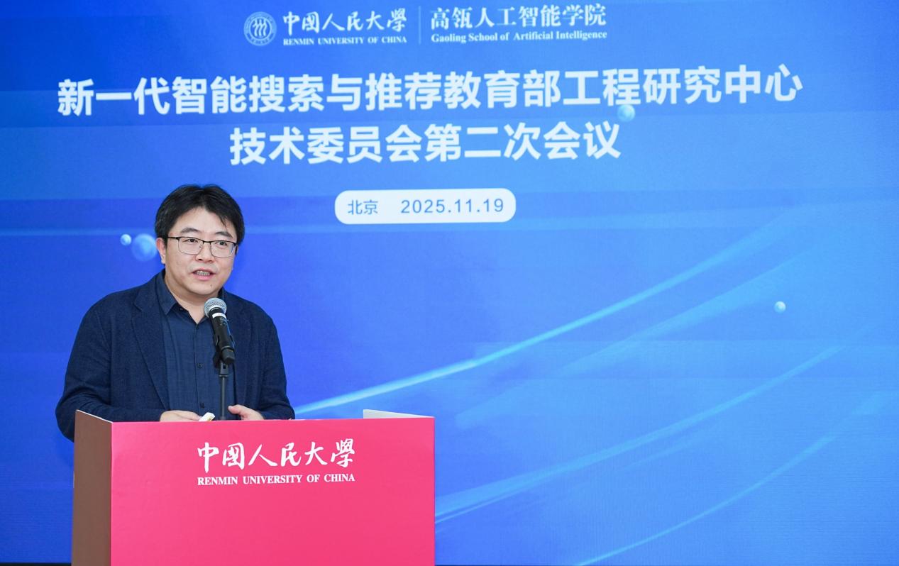 2025年11月19日,新一代智能搜索与推荐教育部工程研究中心(以下简称“中心”)技术委员会第二次会议在中国人民大学立德楼1826多功能厅召开。中国人民大学副校长王小虎出席会议并致辞。会议由中心技术委员会主任、中国科学院院士胡事民,中心技术委员会副主任、学校明理书院院长杜小勇和科学技术发展部部长王亚培共同主持。中心主任、高瓴人工智能学院执行院长文继荣,以及来自国内知名院校和科研机构的40余位专家学者参加会议。
