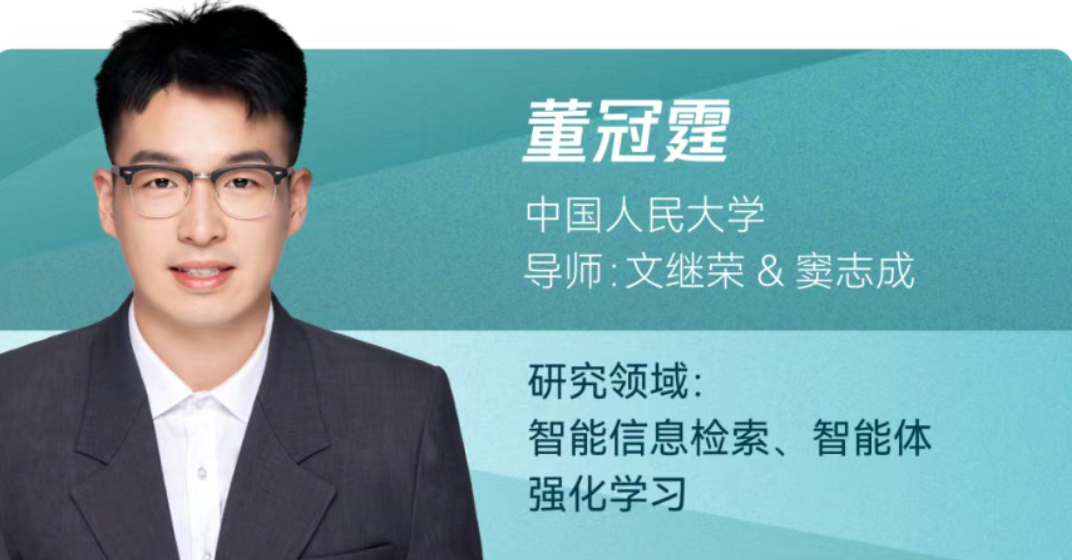 董冠霆,高瓴人工智能学院2024级博士生,导师为文继荣教授与窦志成教授,主要研究方向为智能信息检索和智能体强化学习。以第一/共同第一作者身份在ICLR、NeurIPS、ACL、WWW等国际顶级会议发表论文10余篇;其代表工作包括ARPO、Search-o1、Webthinker、 FlashRAG等, 受到国内外研究者的广泛关注。谷歌学术引用量1万余次。个人GitHub项目累计获得星标8000余枚,并在字节跳动Seed、阿里通义千问、快手快意大模型等核心基座大模型团队实习。曾获国家奖学金、北京市优秀毕业生等荣誉,并入选国家自然科学基金青年学生基础研究项目 (博士生)、中国科协青年人才托举工程博士生专项计划资助。