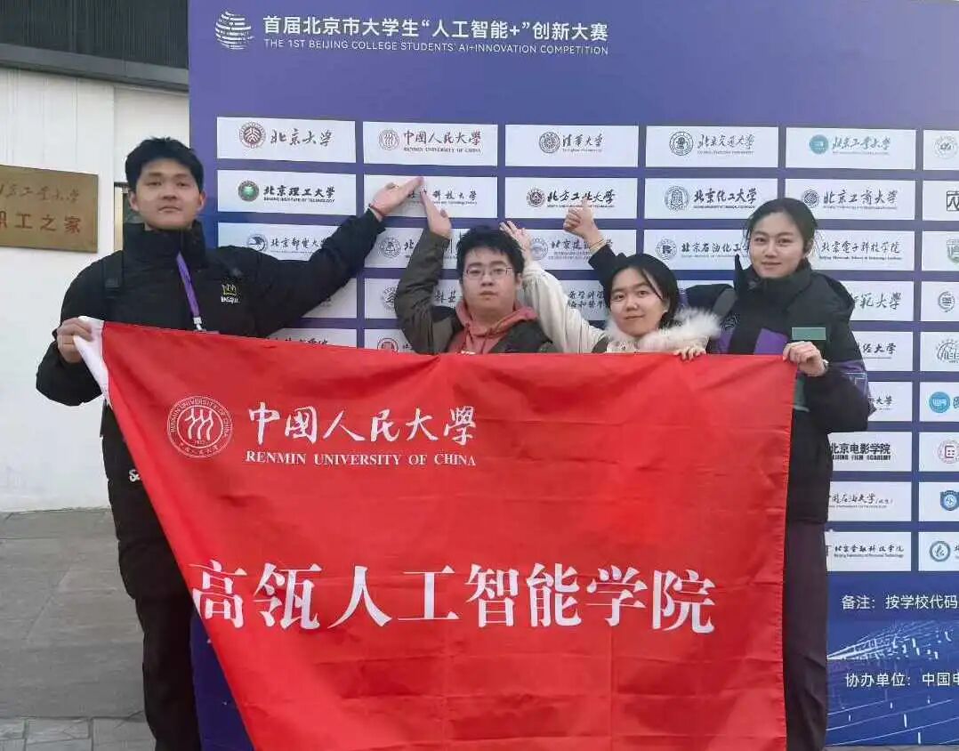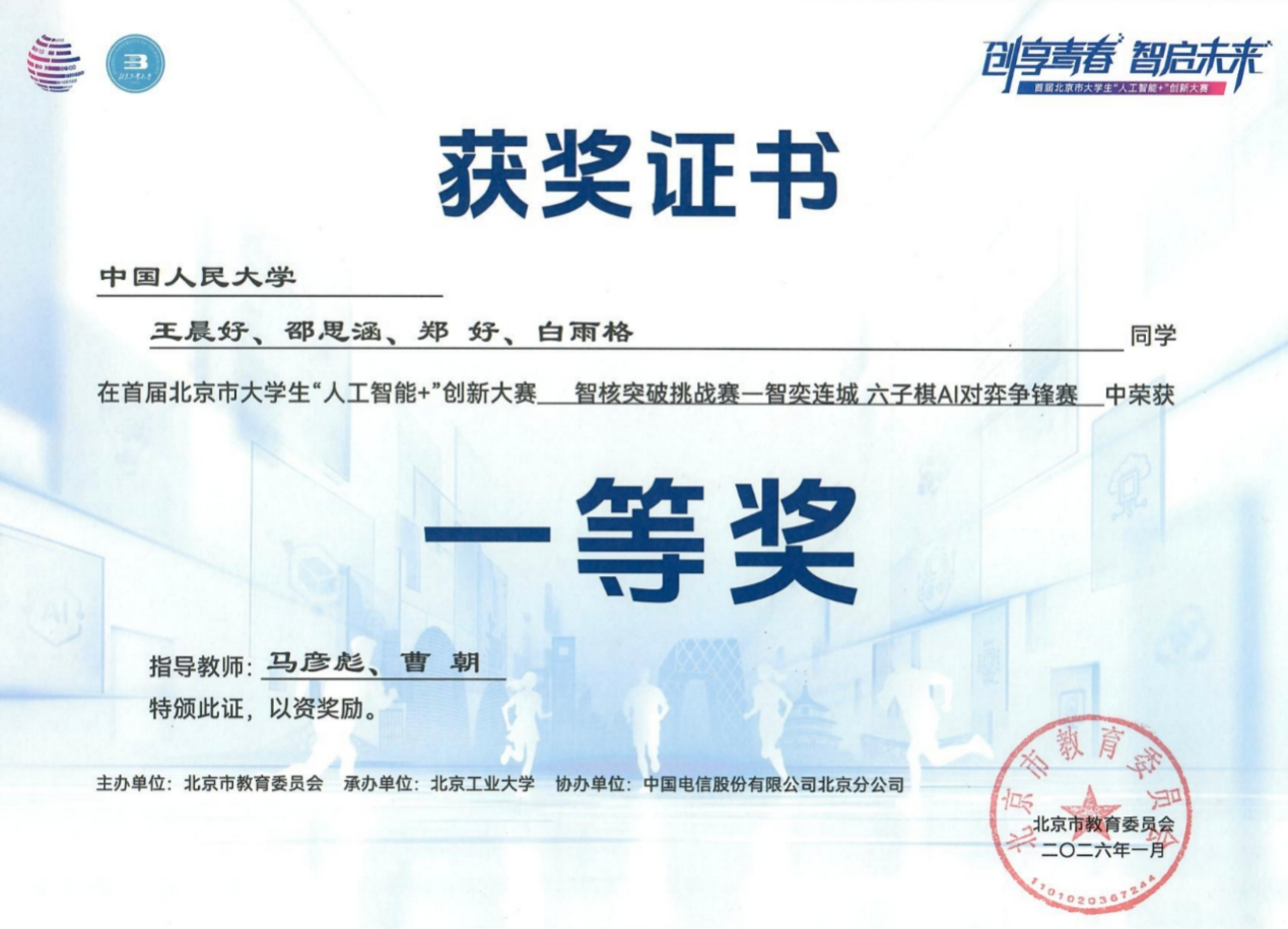 近日,北京市大学生“人工智能+”创新大赛参赛获奖结果公布,中国人民大学高瓴人工智能学院2025级本科生(大一)组建的两支队伍,在学院文继荣院长、曹朝教授、马彦彪老师和两位研究生的指导下,凭借扎实的专业功底和出色的算法设计,从众多高校参赛队伍中脱颖而出,分别斩获北京市大学生“人工智能+”创新大赛的六子棋项目赛道一等奖和三等奖。其中,由王晨好、白雨格、郑好、邵思涵组成的“请输入文本”队获得一等奖,由林锐晋、王梓硕、穆思成(金融数学专业)、曲赞组成的“咪咪”队获得三等奖。
