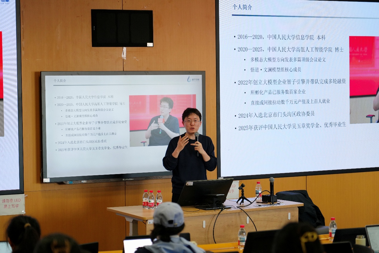 “创业领航”系列讲座由中国人民大学高瓴人工智能学院与高瓴创投 Aseed+ 种子计划联合发起,致力于邀请产业一线的创业者走进校园,分享真实经验与实践思考,搭建连接学术与产业的交流平台。2026年3月25日,创业领航讲座第3讲在立德楼403举办,活动邀请了中国人民大学高瓴人工智能学院2025届毕业生、智子引擎创始人、CEO高一钊博士作了题为“边读书边创业的体验与感悟”的主题分享。