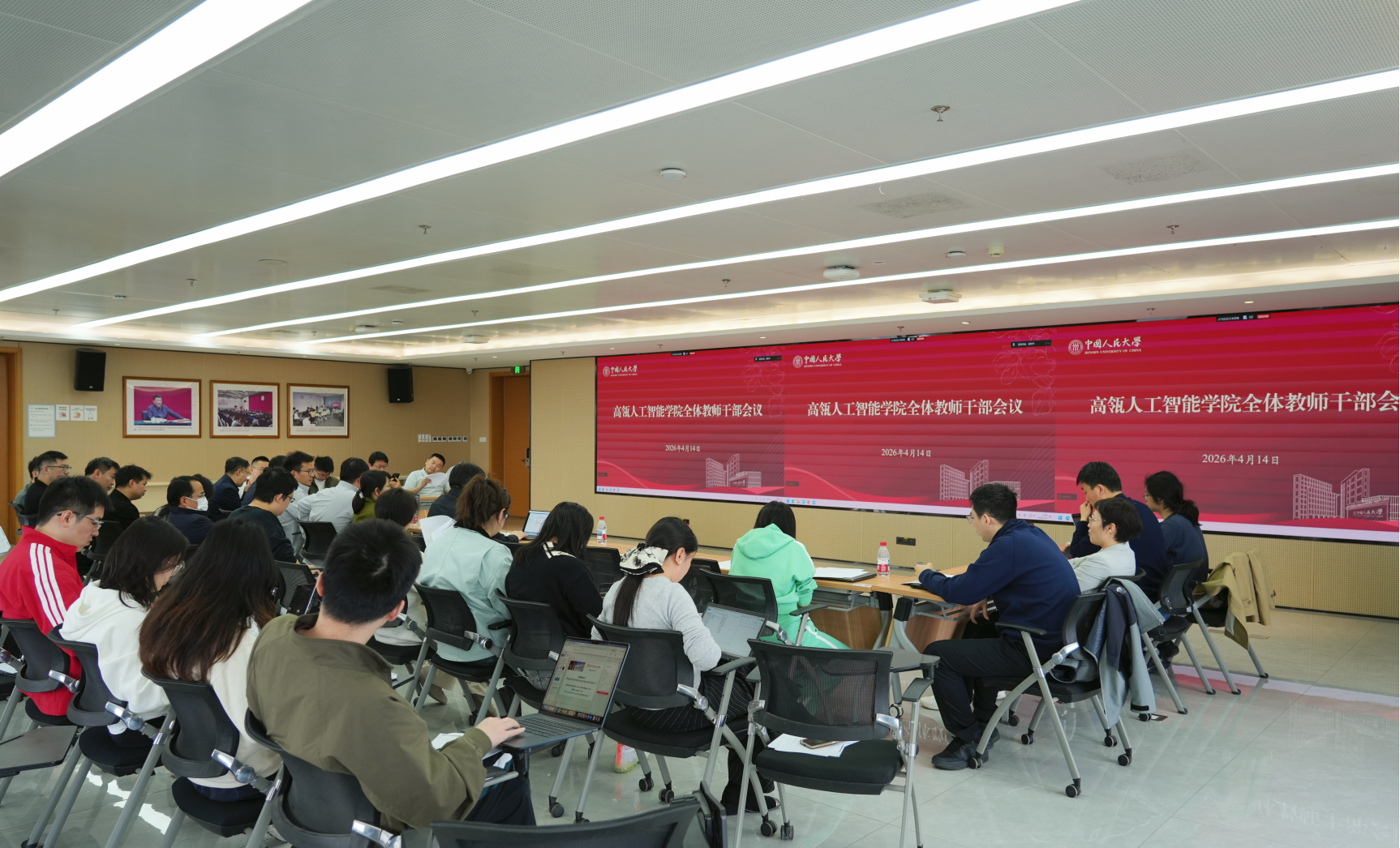 4月14日,中国人民大学高瓴人工智能学院在立德楼1826多功能报告厅召开全体教职工会议,围绕师德师风、采购管理、国际交流等相关内容开展集中学习。高瓴人工智能学院领导班子和全体教职工参加会议。会议由执行院长文继荣主持。