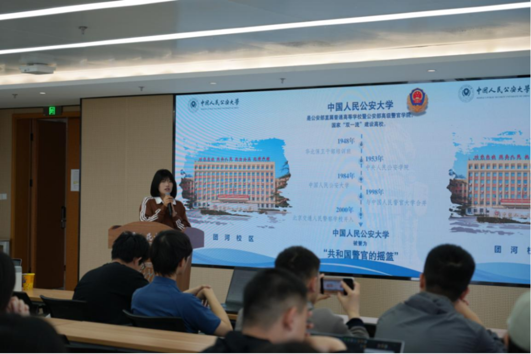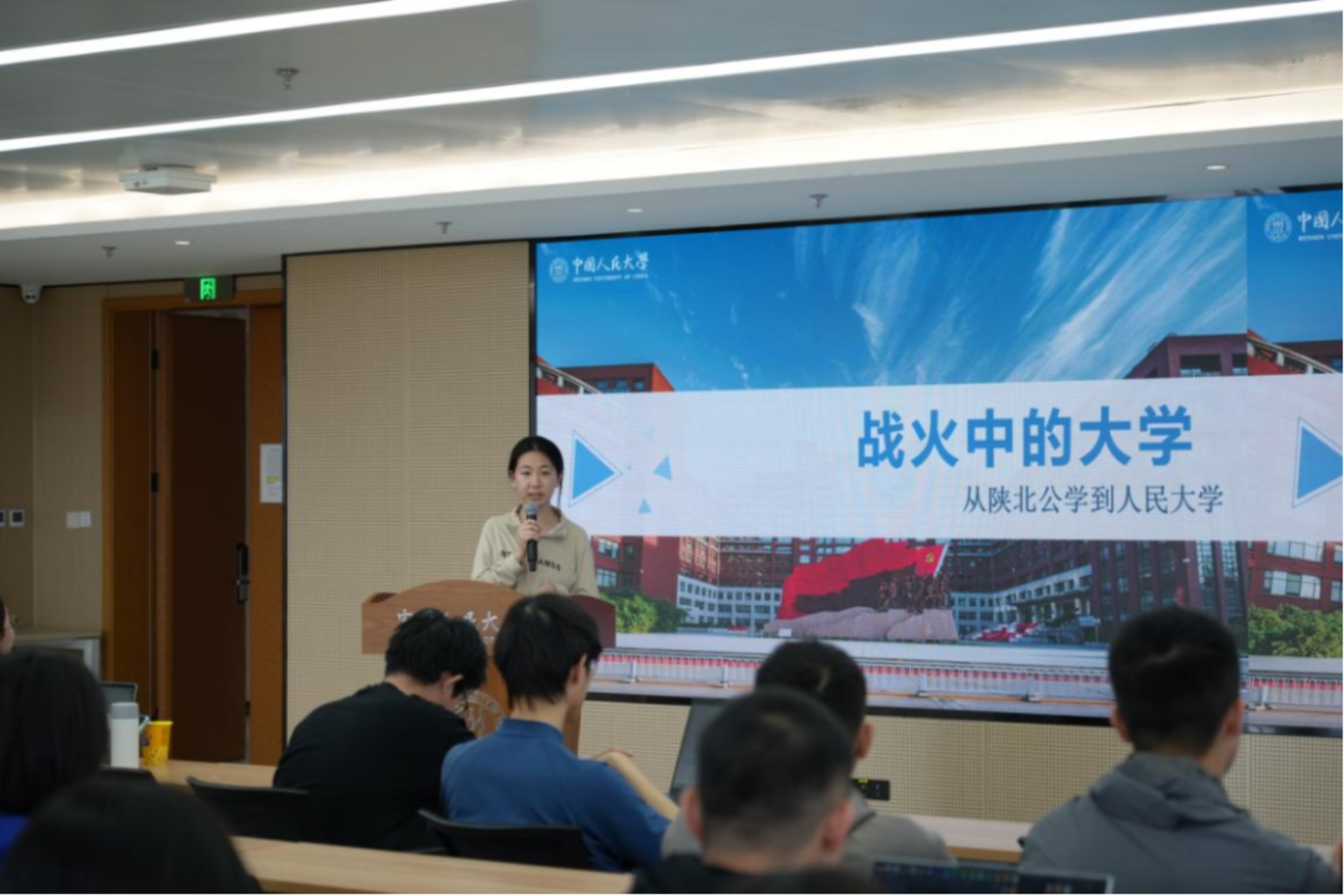 高瓴人工智能学院学生会外联部部长陈子丹作《战火中的大学——从陕北公学到人民大学》专题分享。她系统梳理了学校在党的领导下于烽火中诞生、在奋斗中成长的校史,生动阐释了人民大学“党办的大学让党放心、人民的大学不负人民”的精神内核,引发两校学子强烈共鸣。