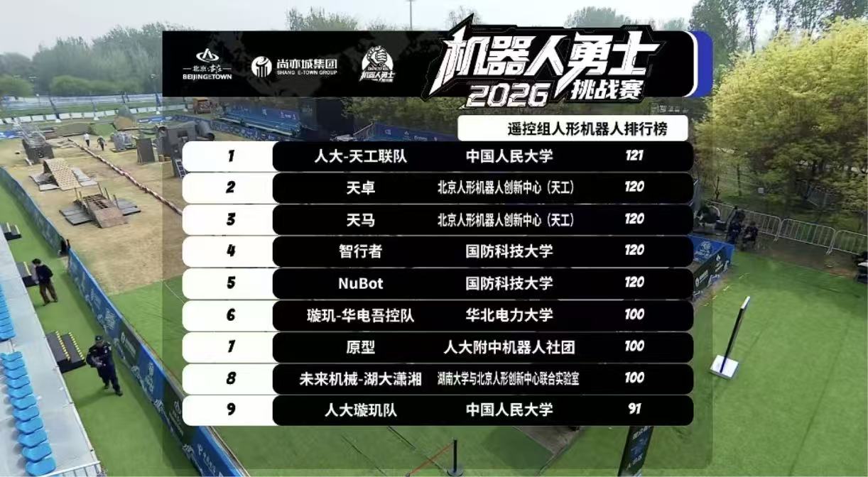 在刚刚落幕的2026机器人“勇士”挑战赛上,中国人民大学高瓴人工智能学院与北京人形机器人创新中心(天工)组成的人大-天工联队,凭借项目技术分位列第一,更成为全场唯一成功尝试“梅花桩—人形终极挑战”的队伍。