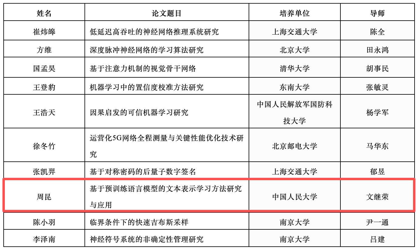 近日,中国人民大学高瓴人工智能学院文继荣教授、赵鑫教授指导的博士生周昆入选2025年“CCF博士学位论文激励计划”。“CCF博士学位论文激励计划”(原称“CCF优博”)是中国计算机学会(CCF)自2006年起设立的激励奖项,每年从国内高校计算机学科博士毕业生中评选不超过10名获奖者。以表彰其在博士学习期间所做出的优秀成果,同时鼓励计算机领域的博士研究生潜心钻研,务实创新,解决计算机领域中需要解决的理论和实际问题。
